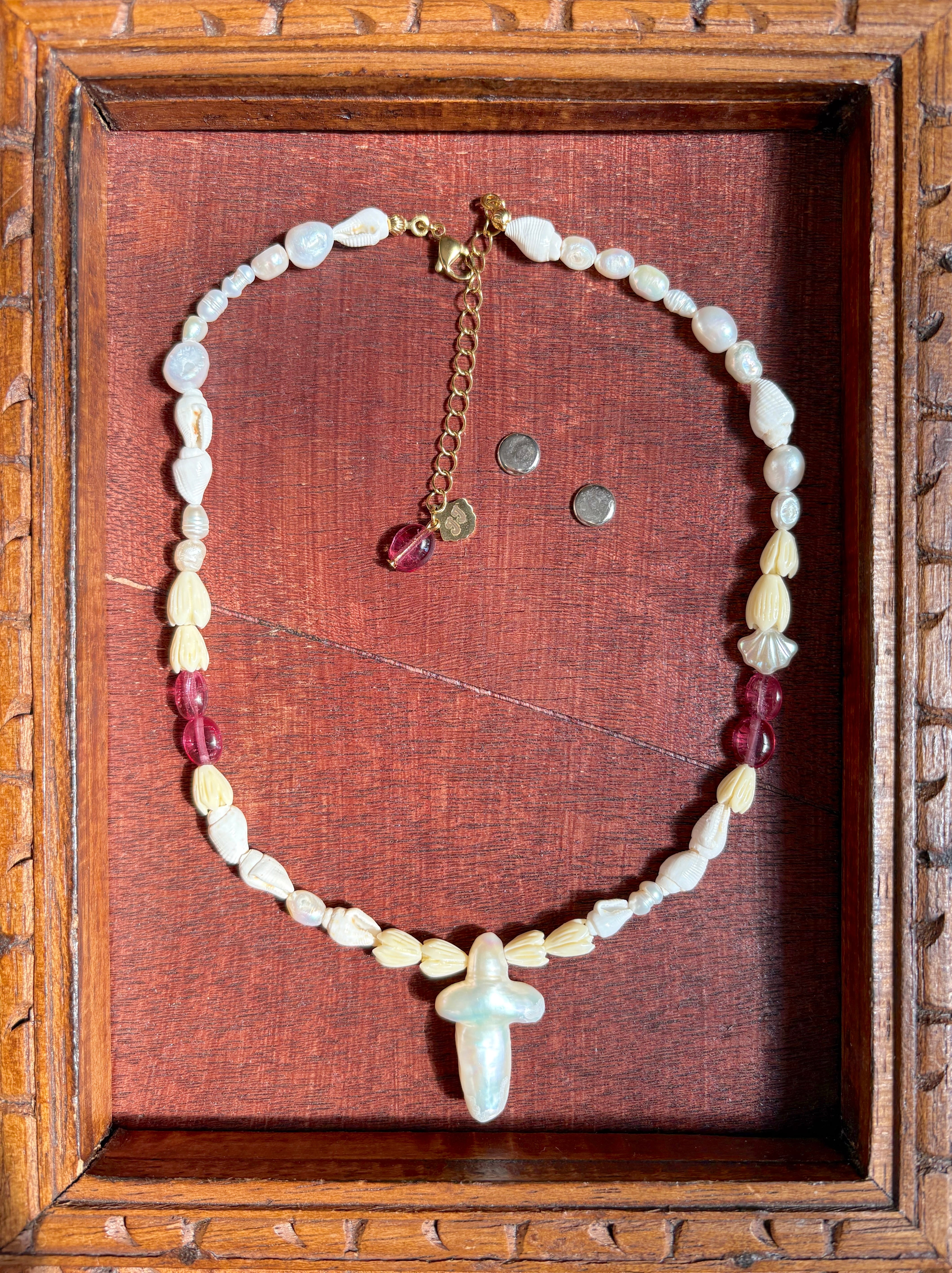 虹色に光るパールクロスが可愛すぎるお守りネックレス♡ 太陽の光で輝くピンクトルマリンもすごく可愛い−♡