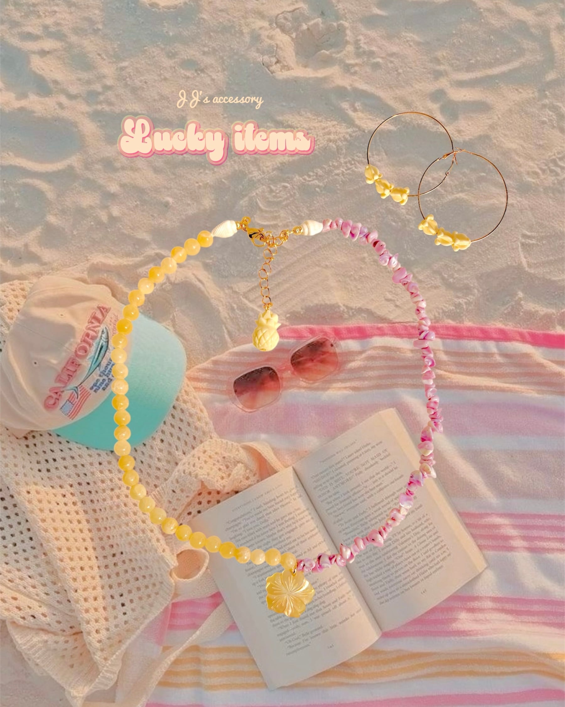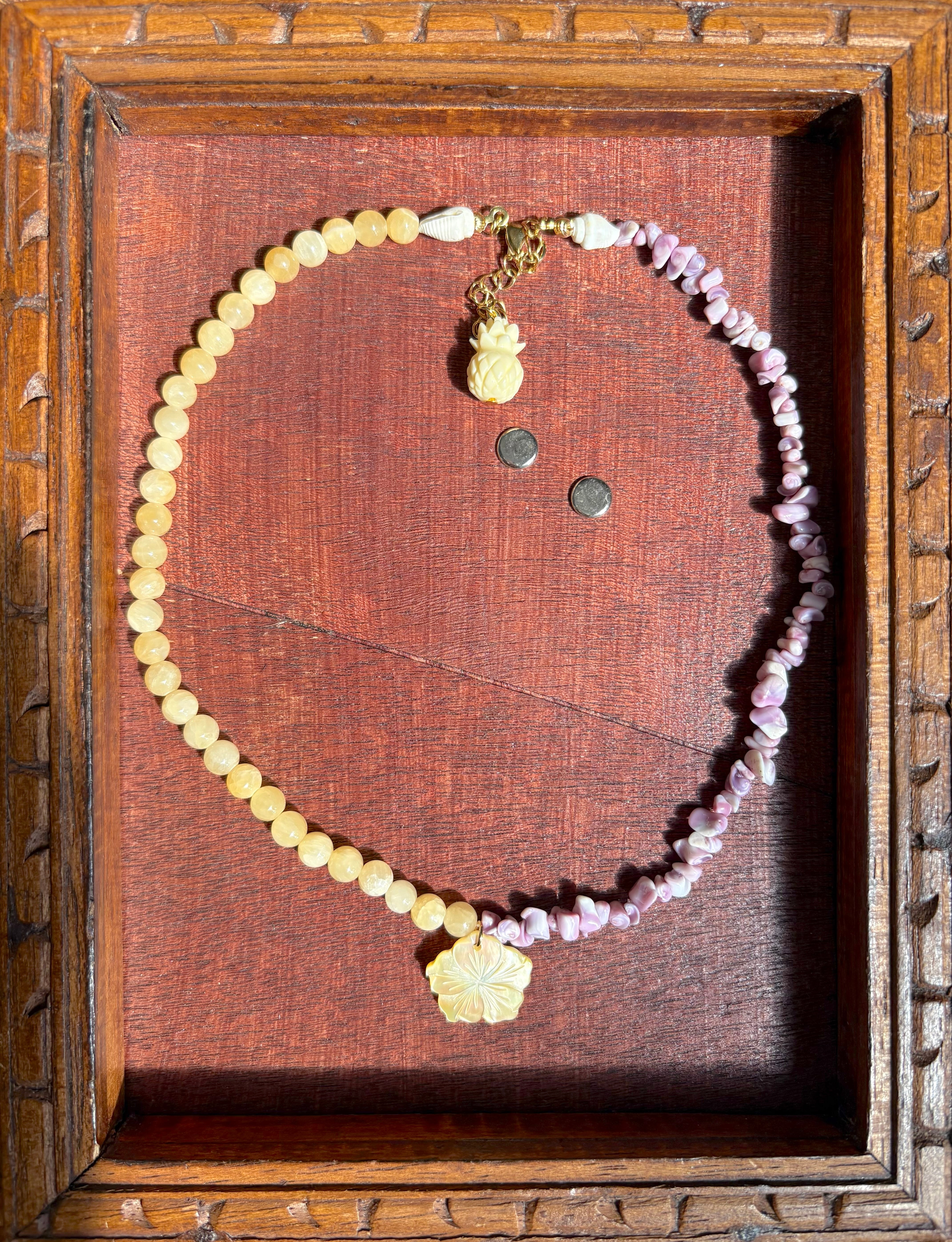 今日が始まる瞬間のサンライズカラーをイメージしました♡朝の眩しい光を浴びて元気なハイビスカスも首元に☺︎幸運のシンボルとも言われるパイナップルも後ろに♡とってもチャーミングで元気いっぱいのお守りネックレスです